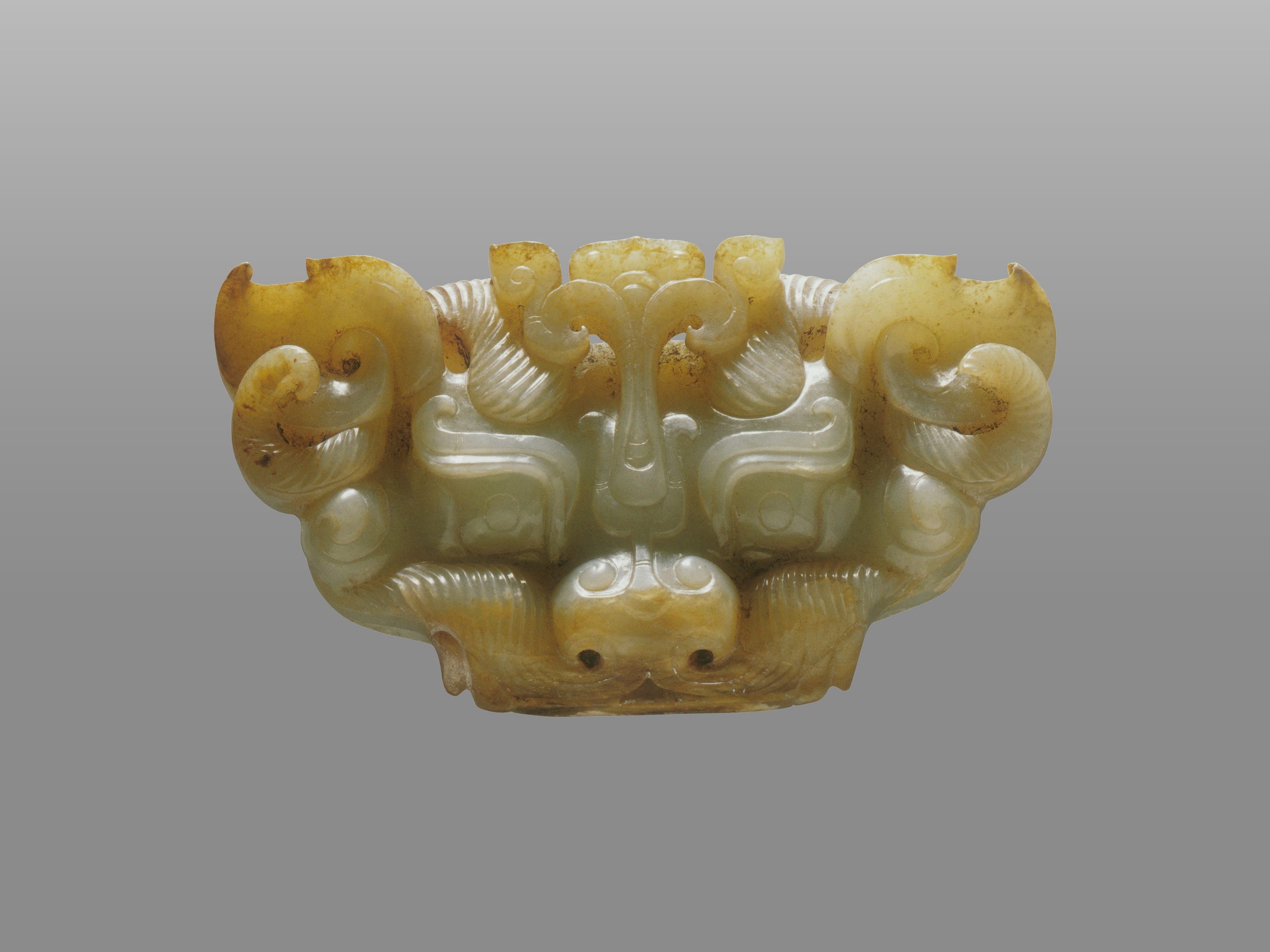 玉兽首是楚王玉枕两端的组件。用玉质上乘的新疆和田青白玉制成,晶莹温润。玉兽首采用高浮雕和透雕技法雕琢而成,构图复杂而严谨,线条流畅而生动,把瑞兽刻画得既威严又无恐怖感。