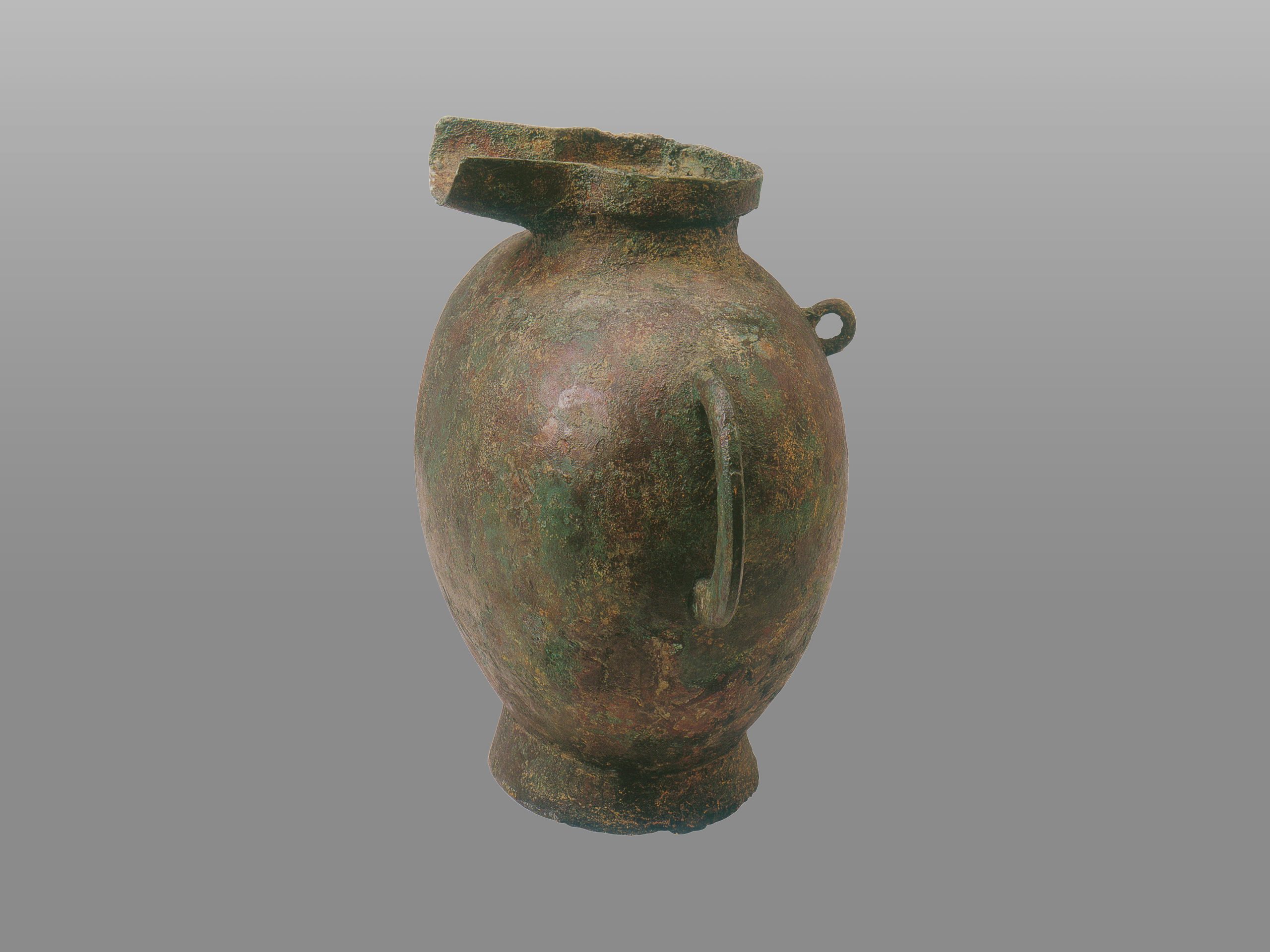 铜扁壶与银盆、银鋗、铜鉴等沐浴用器同出,当属沐浴器具,是沐浴时用来舀水或往浴者身上浇水用的。该扁壶造型特殊,不同于当时流行的常规扁壶。